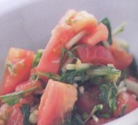 トマトを湯剥きしてヘタを取り、小さめの角切りにします。水菜は長さ1cmに切り、塩を振って軽く揉み、水気を切っておきます。★STEP2
