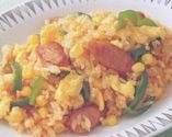 フライパンをさっとふいてサラダ油大さじ2を中火で熱し、ソーセージを1〜2分炒め、ピーマンを加えて炒め合わせます。火を強めてごはん、コーンを加え、ほぐしながらさらに1〜2分炒めて、トマトケチャップ大さじ5、塩小さじ2/3、コショウ少々で味付けし、卵を戻し入れて軽くまぜるとできあがりです。コメント一覧(0)