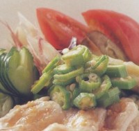 トマトは四等分に、みょうがは薄切りに、きゅうりは蛇腹切りにしてから塩を振ってしんなりさせます。おくらは塩茹でします。★STEP5