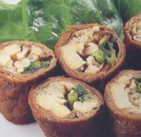 凍り豆腐・生しいたけ・しめじ・えのき・あさつきをまとめて巻き、巻き終わりに片栗粉を付けてとめます。★STEP8