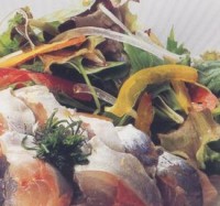 あじの小骨を取り除き、皮を取ってそぎ切りにし器に盛りつけます。★STEP3