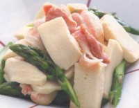 グリーンアスパラの根元の皮をむき、斜め切りにします。★STEP4