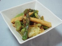 キャベツは食べやすい大きさに切り、アスパラは根元のかたい部分を切り落として、3等分にする。たけのこは短冊切りにする。★STEP2